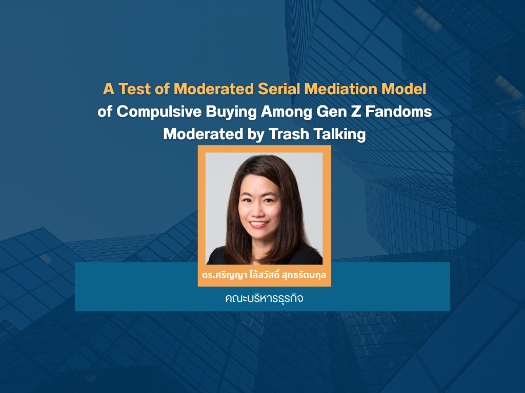 งานวิจัยเรื่อง A Test of Moderated Serial Mediation Model of Compulsive Buying Among Gen Z fandoms Moderated by Trash Talking โดย ดร.ศริญญา ไล้สวัสดิ์ สุทธรัตนกุล คณะบริหารธุรกิจ