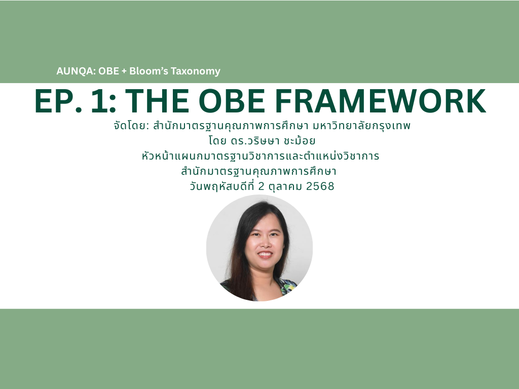สำนักมาตรฐานคุณภาพการศึกษา มหาวิทยาลัยกรุงเทพ จัดอบรมเรื่อง AUN-QA: OBE + Bloom's Taxonomy โดย ดร.วริษษา ชะม้อย หัวหน้าแผนกมาตรฐานวิชาการและตำแหน่งวิชาการ วันพฤหัสบดีที่ 2 ตุลาคม 2568