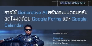 ศูนย์คอมพิวเตอร์ มหาวิทยาลัยกรุงเทพจัดอบรมเรื่อง การใช้ Generative AI สร้างระบบตอบกลับอัตโนมัติด้วย Google Forms และ Google Calendar โดย อ.กฤชทร พชรเกษมสุข อาจารย์ประจำศูนย์คอมพิวเตอร์ วันพฤหัสบดีที่ 20 พฤศจิกายน 2568